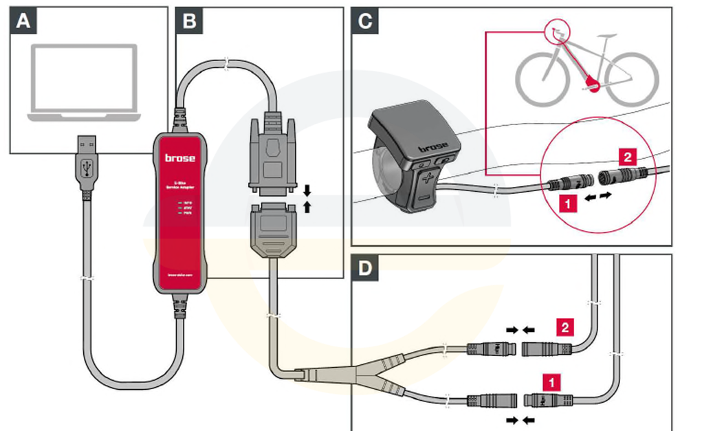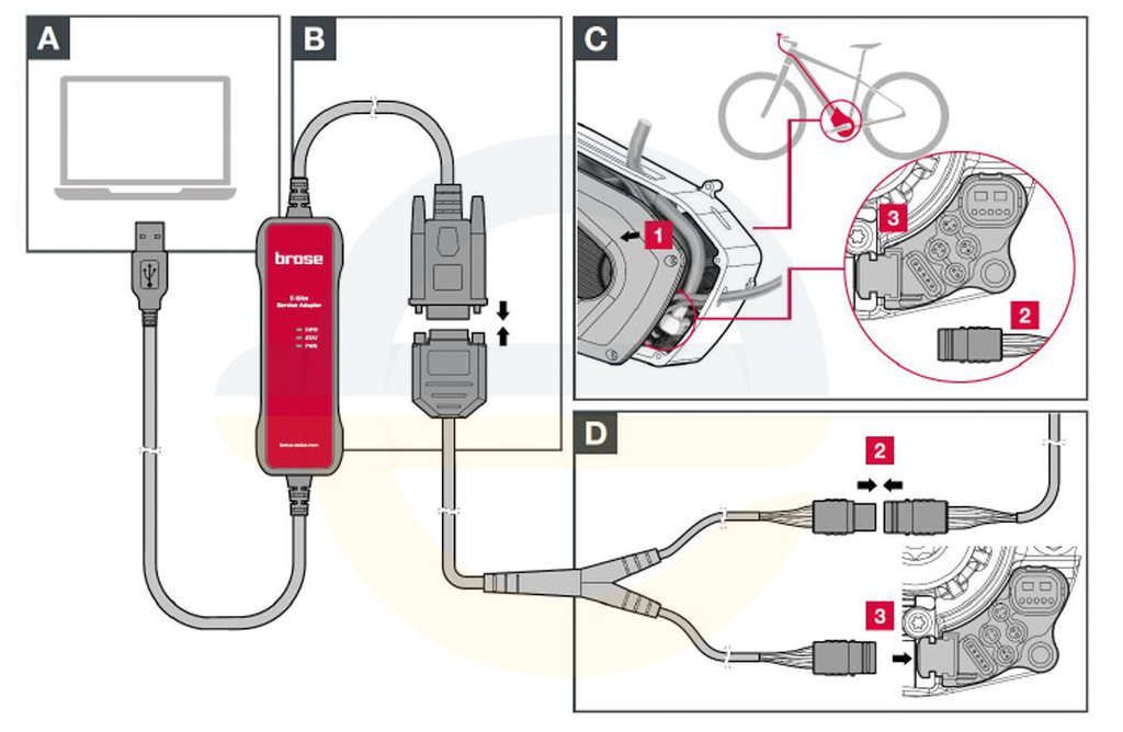 Met de Brose E-Bike Service Adapter heeft de Service Tool toegang tot alle Brose systeemcomponenten.